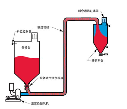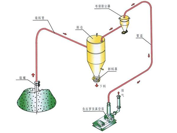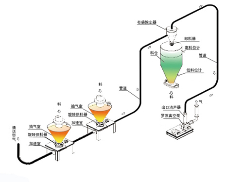 稀相輸送設備一般采用羅茨風機為氣源,配套設置鎖氣器、抽氣室、加速室等設備,實現(xiàn)粉顆狀物料的輸送。適用于現(xiàn)場沒有輸送氣源,輸送量較小,輸送距離較近的應用場合??蓪崿F(xiàn)連續(xù)輸送,輸送速度可調。